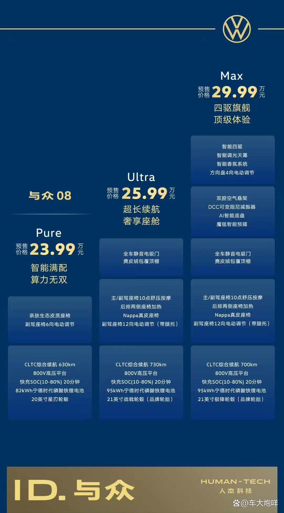 动力方面,大众与众08搭载纯电系统,其中Pure版和Ultra版采用后置单电机布局,驱动电机最大功率230千瓦,Max版配套最大功率140千瓦的前电机与最大功率230千瓦的后电机。在此基础上,大众与众08全系搭载800伏高压平台,其中Pure版匹配82千瓦时磷酸铁锂电池,CLTC工况纯电续航630公里;Ultra 版和Max版配套95千瓦时磷酸铁锂电池,对应的CLTC工况纯电续航里程分别为730公里、700公里。